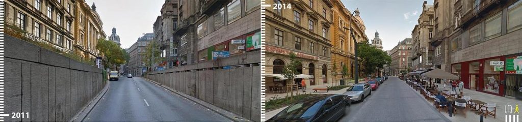 Petőfi Sándor utca a forgalomcsillapítás előtt és után: https://www.urb-i.com/before-after?lightbox=dataItem-iwcehz191