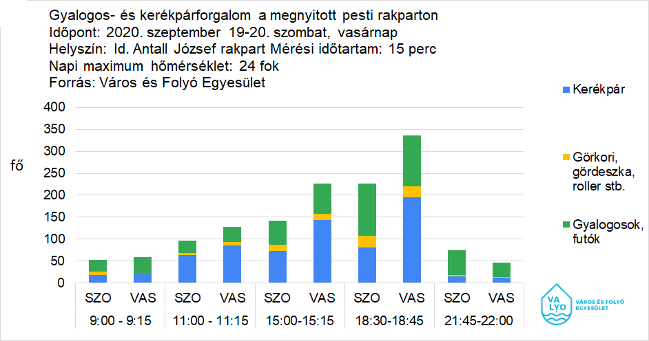 Tavasz óta hétvégente a városlakóké a pesti alsó rakpart. A megnyitott rakpart rövid időn belül a város egyik legnépszerűbb köztere lett, az emberek már az első hétvégén birtokba vették. A Valyo mérése szerint a szeptember 19-20-i hétvégén csupán negyed óra alatt 336-an haladtak el a mérési pont előtt gyalog, futva, rollerrel, görkorival vagy biciklivel. Ez nem meglepő, hiszen a belvárosban a keskeny járdákon, parkoló és áthaladó autókkal terhelt, szennyezett levegőjű utcákon nincs sok lehetőség kellemes időtöltésre.