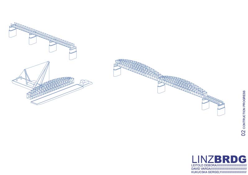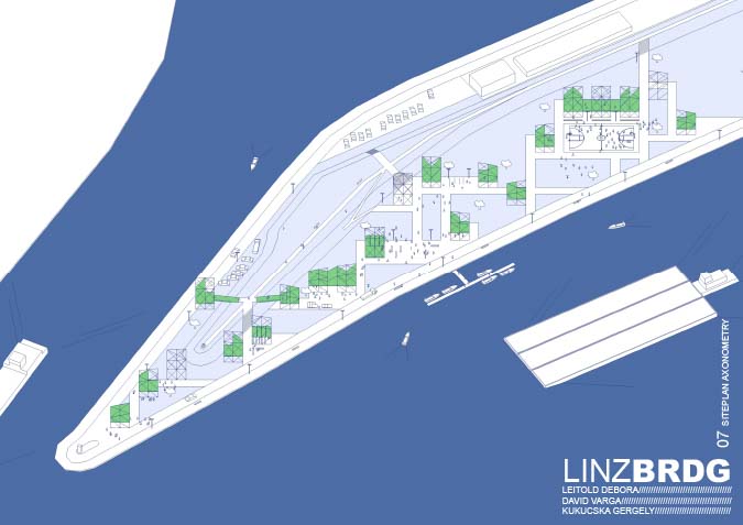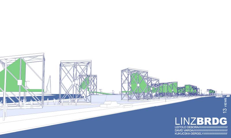 Csapatunk a vasúti hidat 90 fokban elforgatta és a jelenlegi helye mellé a partra helyezte. Az lemezeket felszeleteltük és eltoltuk egymástól, így a távolból nézve megmaradt az egybefüggő hídszerkezet, de sok különböző funkciót kapó térben eltolódott egymástól.