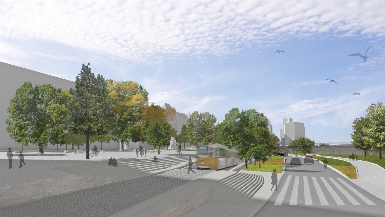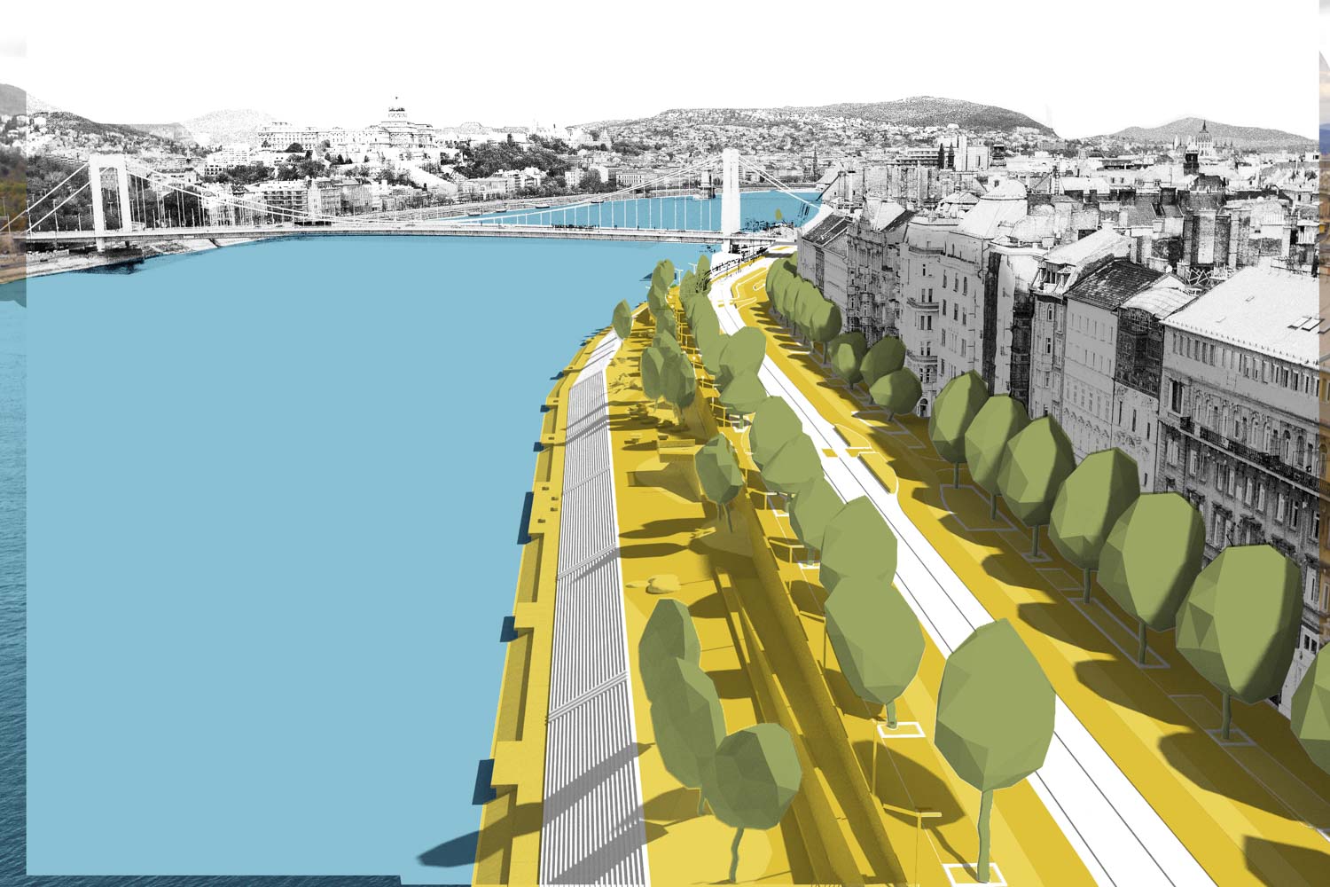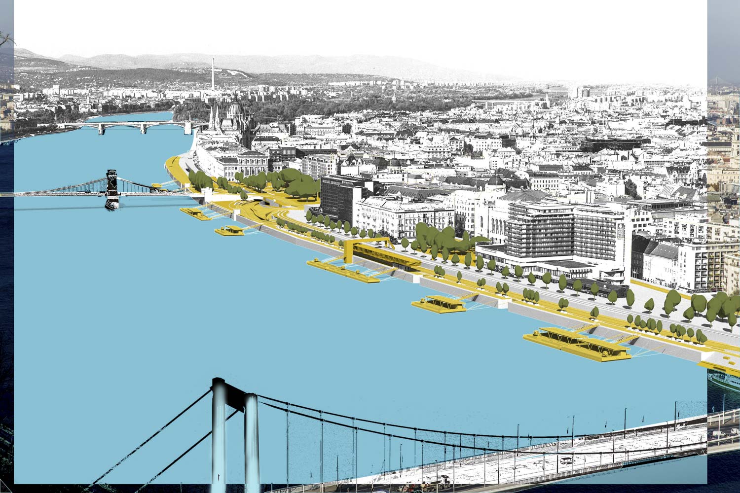 A Széchenyi téren a lehető legnagyobb zöldfelületet hoztuk létre, amely zavartalan forgalom biztosítása mellett kialakítható. Az új, minden irányból könnyen megközelíthető térre interaktív részeket, vízjátékot terveztünk, és széles lépcsővel egybenyitottuk a vízparton lévő parkokkal, amelyeket a fejlesztést követően teljes egészében megtartottunk. A vízen úszó vendéglátóhelyekkel egészítettük ki a Főváros Duna-parti Fő tereként definiált teret.