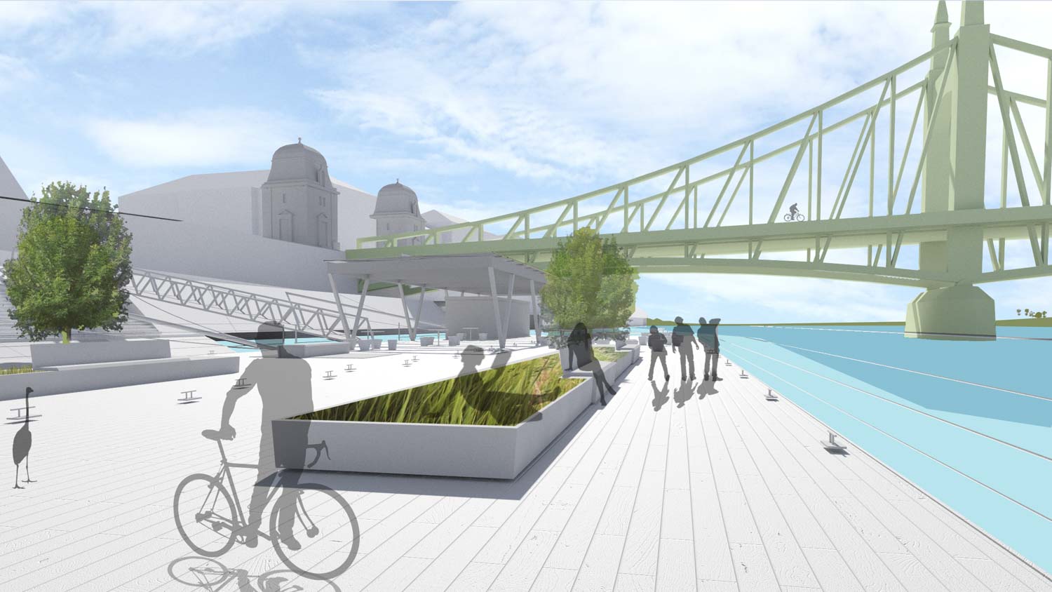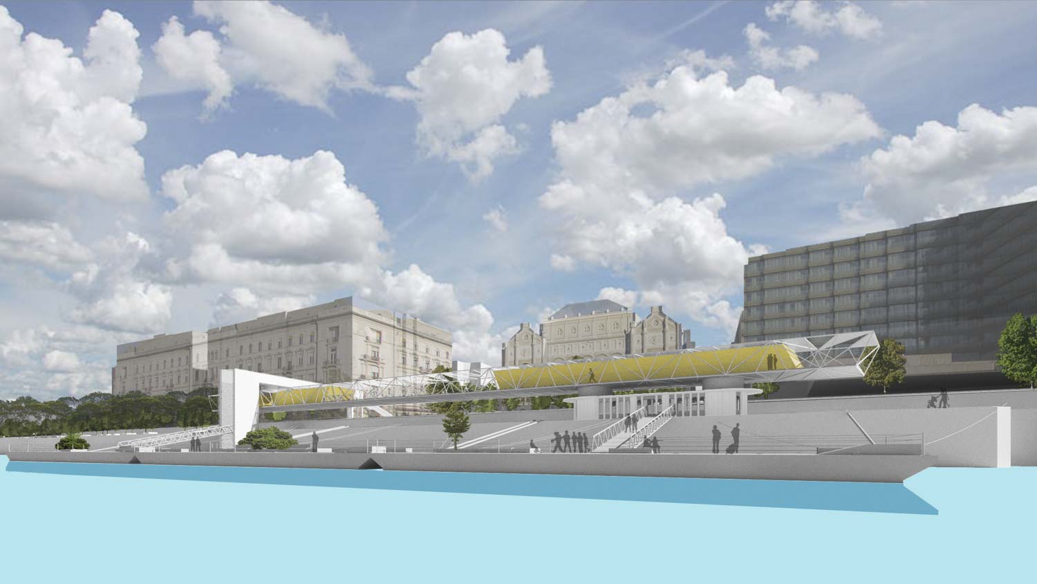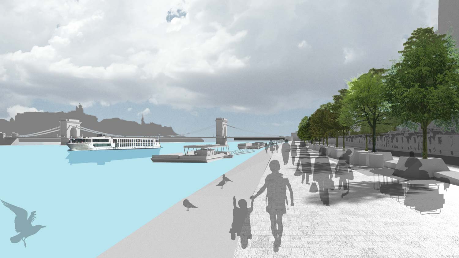 Szállodahajókat csak a vízparti szállodák előtt és a magas, nem lépcsős partoknál tudunk elképzelni, hogy a nagyméretű hajók ne takarják el a városlakók és a többi turista elől a túlsó part látványát. Úszóstégeken további köztereket, kisebb hajóállomásokat és vendéglátó egységeket helyeztünk el – mindenhol éppen azt a funkciót, ami a kapcsolódó partszakaszról hiányozik. Megoldottuk a Március 15-e tér vízkapcsolat-problémáját is: az itt kialakított, könnyed kilátóterasz remek folytatása a jó hangulatú, de eddig a víztől elzárt térnek.