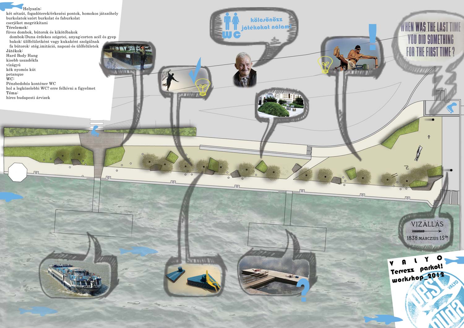 Kezdetekben több installációval és kisebb rendezvénnyel ugyan megtelt élettel a partszakasz, de sok hiányosságra hívta fel a figyelmet. Ezért szerveztük meg a Tervezz Parkot!-workshopot, amire bárki jelentkezhetett, és végül 12 tervező foglalkozott a tér megújításának lehetőségeivel.