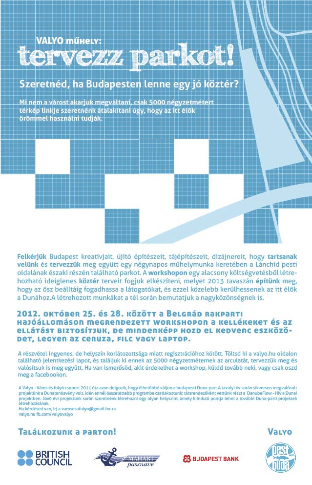 Négy napos műhelymunkában több tervet készítettünk a Lánchíd pesti oldalának északi hídfőjéhez. A munkában egy tucat lelkes fiatal, főleg tájépítész vett részt, ezek a tervek inspirálták a Valyo part több hetes fesztivál programját és térkialakítását.
